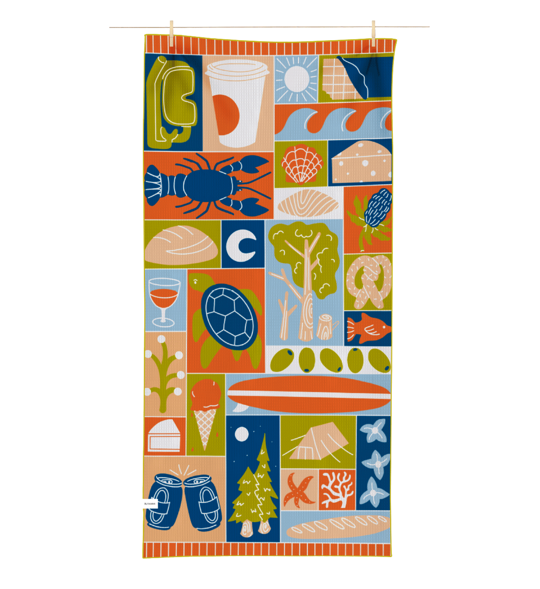 Margaret River is known for its impressive surf beaches, delicious food and drink, lush nature, and warm community spirit. All these impressions come together in this design: from hand-drawn details that evoke shell collecting on the beach with a warm coffee in hand, to long drives along roads lined with karri trees. This towel feels like a visual diary – personal, yet lovingly designed for you.